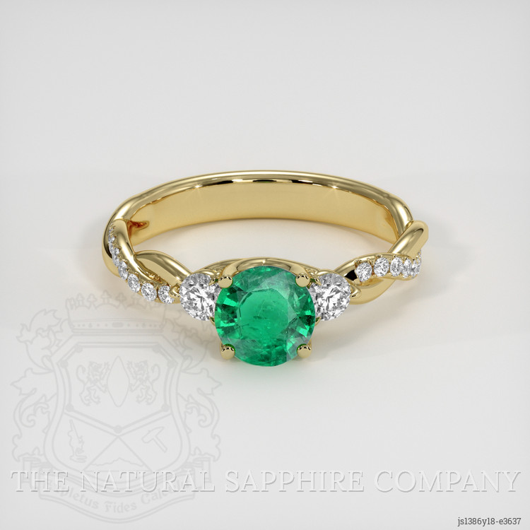 This ring from The Natural Emerald Company centers on a transparent green emerald weighing 0.70 carat, cut as a round mixed brilliant, with calibrated dimensions of 6.02 x 6.02 x 3.38 mm. The gem exhibits vivid color saturation and an excellent polish, attributes that are immediately apparent to an attentive buyer and that contribute materially to both visual impact and market value. The clarity is described as very slightly included, evaluated at eye level, and this degree of inclusion is consistent with an eye clean presentation that preserves brilliance and saturation without compromising structural integrity. The emerald originates from Zambia, a source renowned for producing stones with lively green tones often enhanced by a slight bluish component, and the piece carries a standard enhancement that is widely practiced in the trade to stabilize and improve the visual appearance. For a customer seeking a combination of natural origin, quantified dimensions, and transparent disclosure of treatment, this emerald meets high expectations and represents both aesthetic and gemological strength in the center stone.