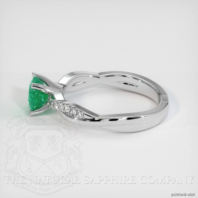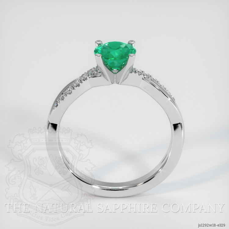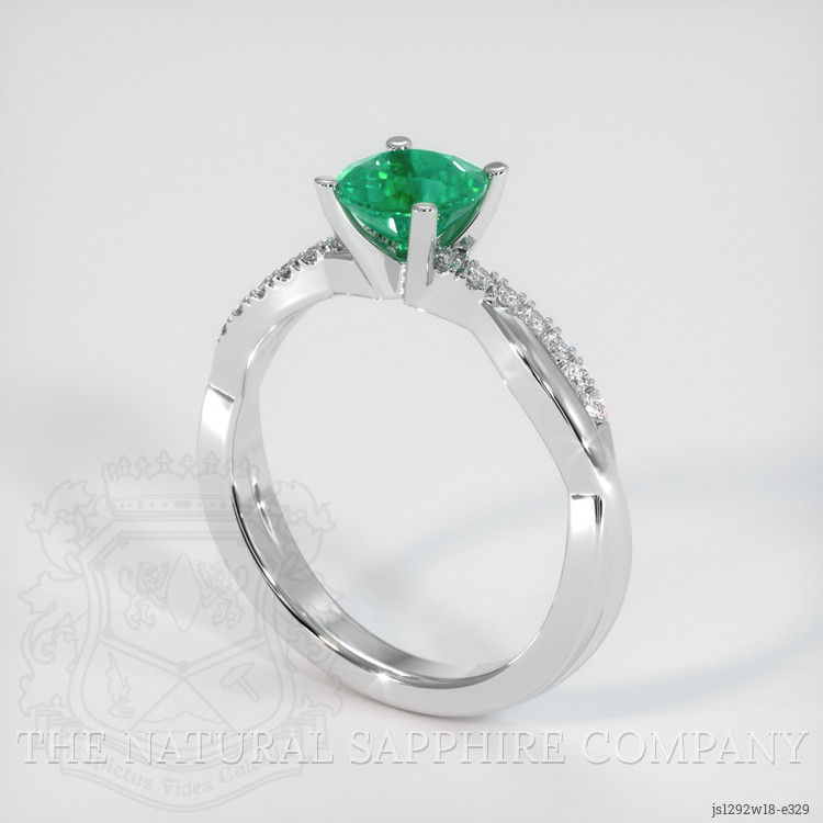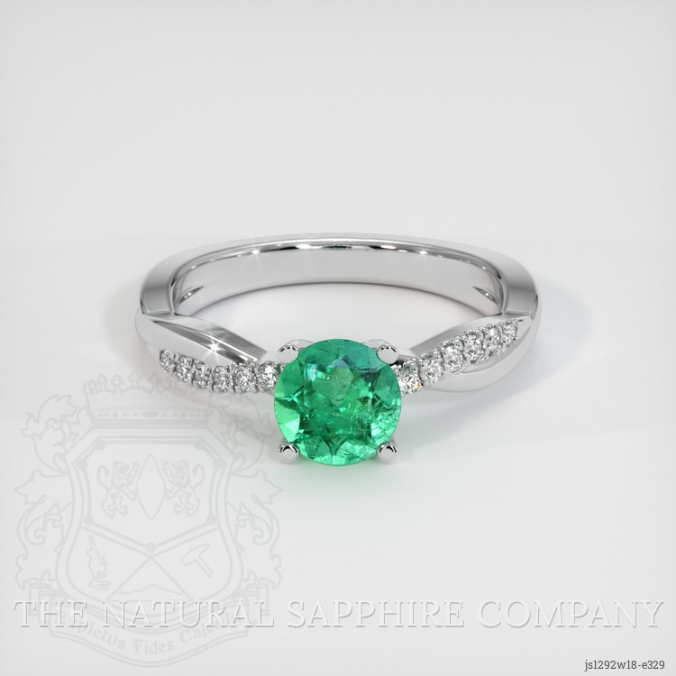 The ring features a beautiful, transparent 0.73 carat round shape green emerald with the dimensions of 6.22 x 6.11 x 3.69 mm and a mixed brilliant cut. It has a clarity grade of very slightly included (evaluated at eye level), light color saturation, and an excellent polish. The origin of this emerald is Zambia.