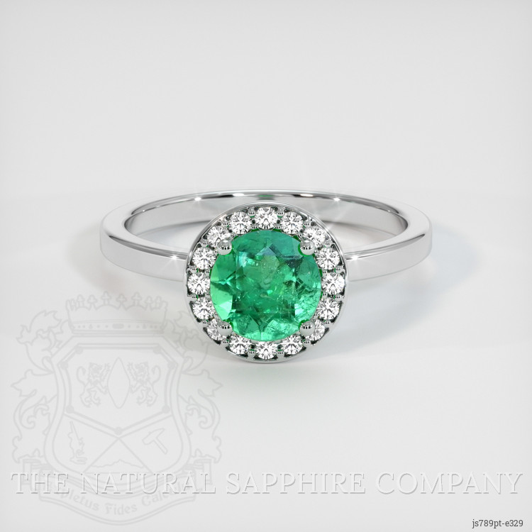 The ring features a beautiful, transparent 0.73 carat round shape green emerald with the dimensions of 6.22 x 6.11 x 3.69 mm and a mixed brilliant cut. It has a clarity grade of very slightly included (evaluated at eye level), light color saturation, and an excellent polish. The origin of this emerald is Zambia.
