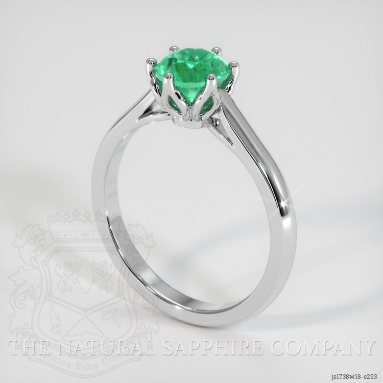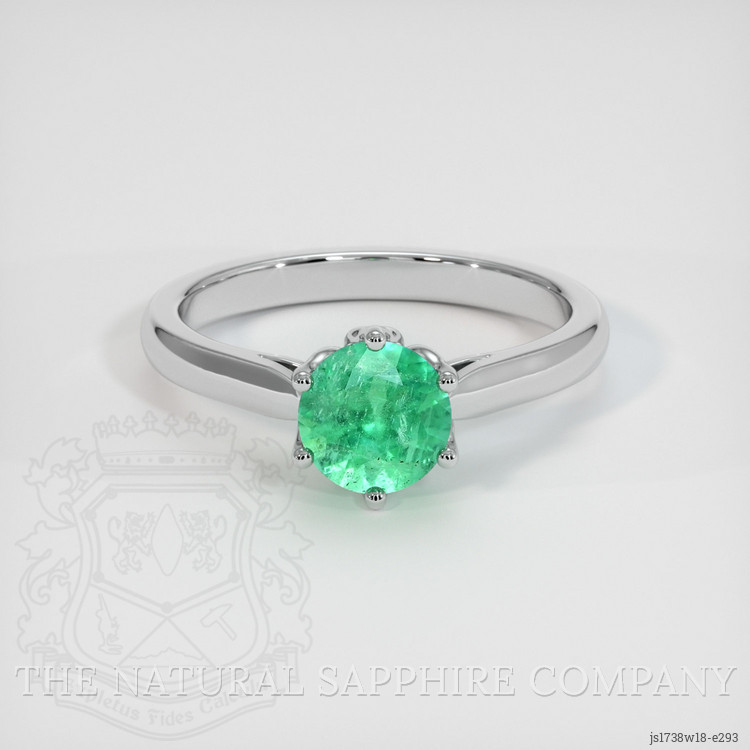 The exquisite ring showcased here is a remarkable piece of fine jewelry that combines both aesthetic beauty and craftsmanship. At its heart lies a breathtaking green emerald, known for its alluring and vibrant color. This emerald, weighing 0.77 carats, holds a round shape with dimensions measuring 6.07 x 6.05 x 4.10 mm. It has been expertly cut into a mixed brilliant style, enhancing its sparkle and adding a dynamic play of light that captures attention from every angle. Despite having a clarity grade of included, as evaluated at eye level, the gemstone's light color saturation maintains its appeal, delivering a subdued yet captivating green hue.