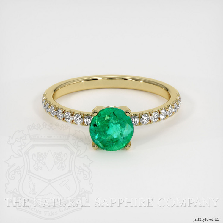 The ring features a beautiful, transparent 0.80 carat round shape green emerald with the dimensions of 6.08 x 6.01 x 4.09 mm and a mixed brilliant cut. It has a clarity grade of slightly included (evaluated at eye level), medium color saturation, and an excellent polish. The origin of this emerald is Zambia.