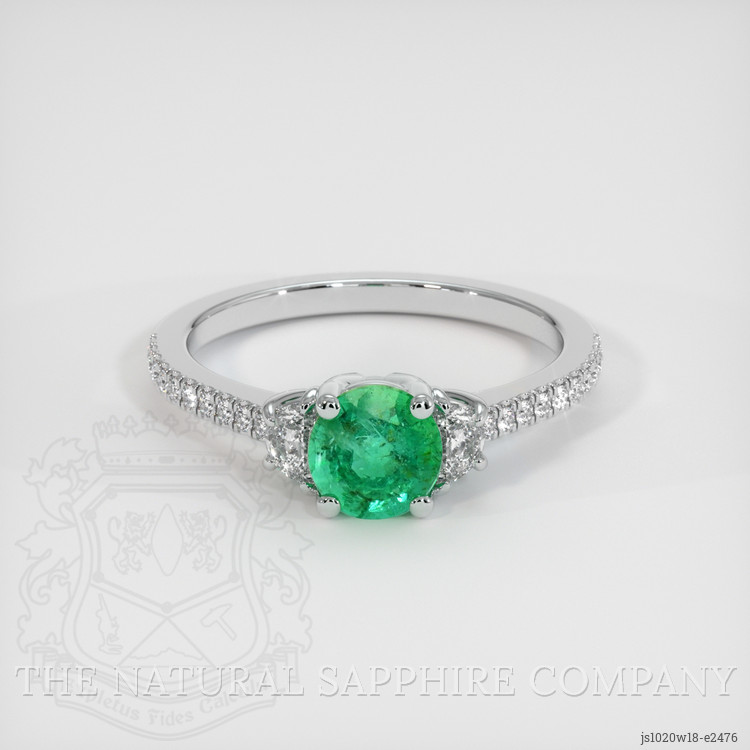 The ring features a beautiful, transparent 0.85 carat round shape green emerald with the dimensions of 6.09 x 5.96 x 4.22 mm and a mixed brilliant cut. It has a clarity grade of slightly included (evaluated at eye level), medium color saturation, and an excellent polish. The origin of this emerald is Zambia.