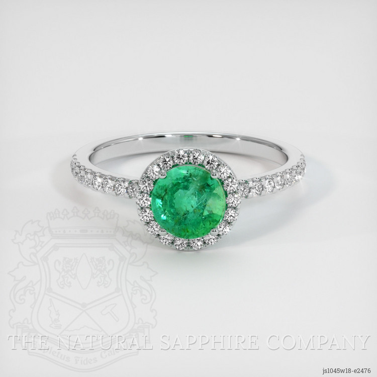 The ring features a beautiful, transparent 0.85 carat round shape green emerald with the dimensions of 6.09 x 5.96 x 4.22 mm and a mixed brilliant cut. It has a clarity grade of slightly included (evaluated at eye level), medium color saturation, and an excellent polish. The origin of this emerald is Zambia.