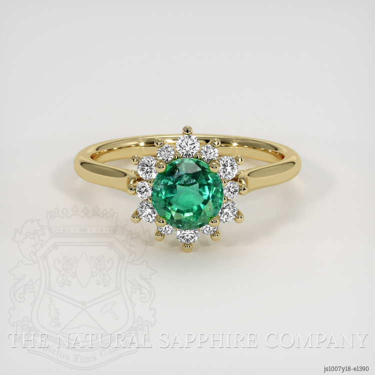 The rich allure of the emerald has captivated hearts for centuries, drawing admiration and reverence from those who cherish its deep historical roots and vibrant, verdant beauty. Our exquisite ring, featuring a transparent 0.89 carat round-shaped green emerald, epitomizes this timeless fascination. Sourced from the legendary mines of Zambia, this emerald is renowned for its stunning, medium color saturation which echoes the lush landscapes of its origin. The mixed brilliant cut enhances its natural radiance, inviting light to dance across its surface with every gesture. Slightly included, the gemstone reveals its natural character, a testament to its earthly journey and a promise of authenticity.