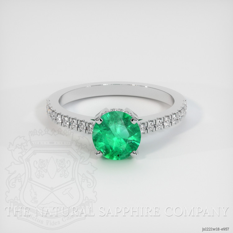 The ring features a beautiful, transparent 0.92 carat round shape green emerald with the dimensions of 6.93 x 6.88 x 4.04 mm and a mixed brilliant cut. It has a clarity grade of slightly included (evaluated at eye level), medium color saturation, and an excellent polish. The origin of this emerald is Zambia.