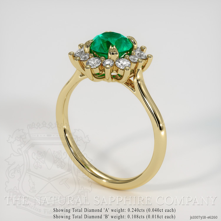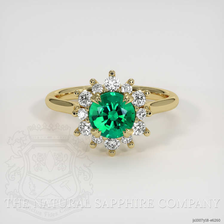 Presenting an exquisite union of history and artistry, this ring by The Natural Emerald Company is a celebration of timeless elegance crafted for discerning admirers of classic design. At its heart is a stunning 0.92-carat emerald, a gem with origins in Zambia, known for its lush landscape and premium gemstone quality. This emerald is not merely a stone, but a manifestation of nature’s splendor, with its round shape and dimensions of 6.27 x 6.27 x 4.53 mm reflecting the depth and richness found only in nature’s finest creations. The mixed brilliant cut of the emerald excels in capturing and reflecting light, creating a vibrant display of brilliance that dances with every subtle movement. The gem’s eye-clean clarity and vivid saturation speak to its unmatched beauty and exceptional quality.