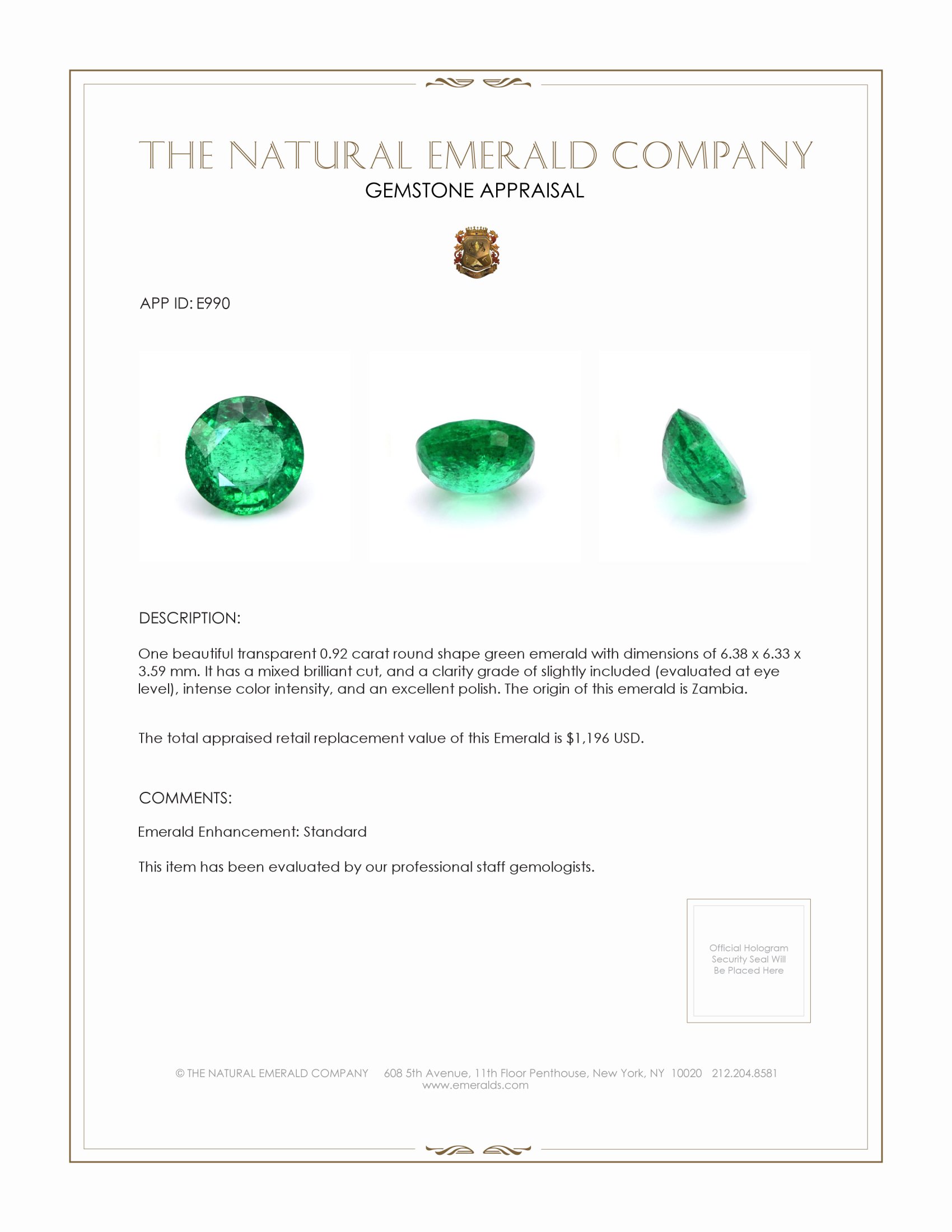 The ring features a beautiful, transparent 0.92 carat round shape green emerald with the dimensions of 6.38 x 6.33 x 3.59 mm and a mixed brilliant cut. It has a clarity grade of slightly included (evaluated at eye level), intense color saturation, and an excellent polish. The origin of this emerald is Zambia.