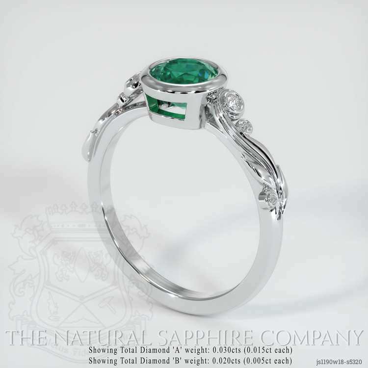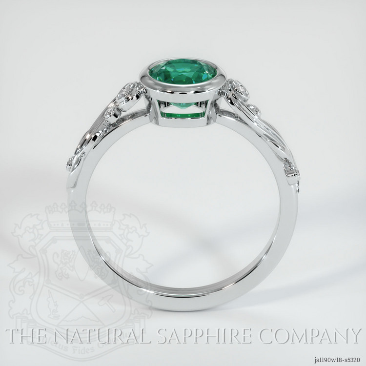 The ring features a beautiful, transparent 0.93 carat round shape green emerald with the dimensions of 6.19 x 6.17 x 4.32 mm and a mixed brilliant cut. It has a clarity grade of included (evaluated at eye level), intense color saturation, and an excellent polish. The origin of this emerald is Zambia.