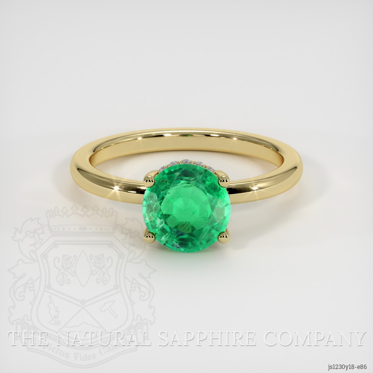 The ring features a beautiful, transparent 1.02 carat round shape green emerald with the dimensions of 6.74 x 6.55 x 3.92 mm and a mixed brilliant cut. It has a clarity grade of very slightly included (evaluated at eye level), medium color saturation, and an excellent polish. The origin of this emerald is Zambia.