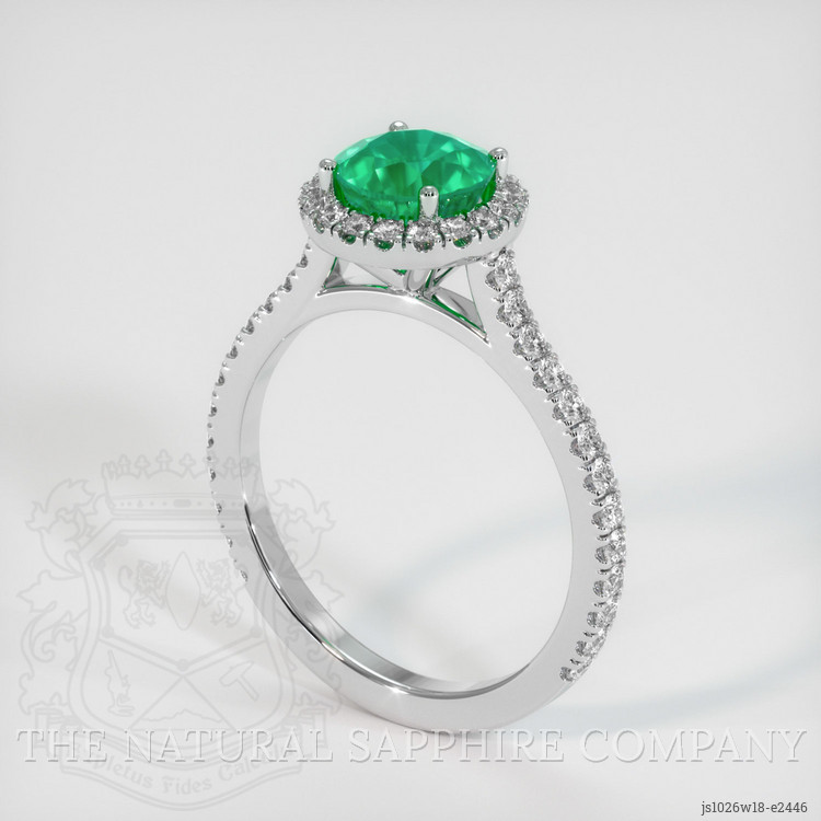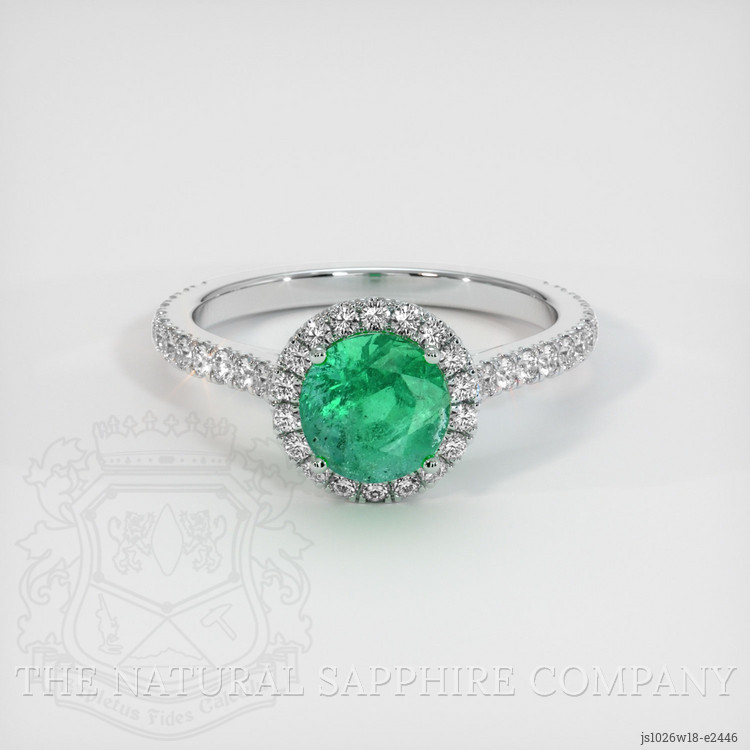 The ring features a beautiful, transparent 1.13 carat round shape green emerald with the dimensions of 6.60 x 6.50 x 5.01 mm and a mixed brilliant cut. It has a clarity grade of slightly included (evaluated at eye level), medium color saturation, and an excellent polish. The origin of this emerald is Zambia.