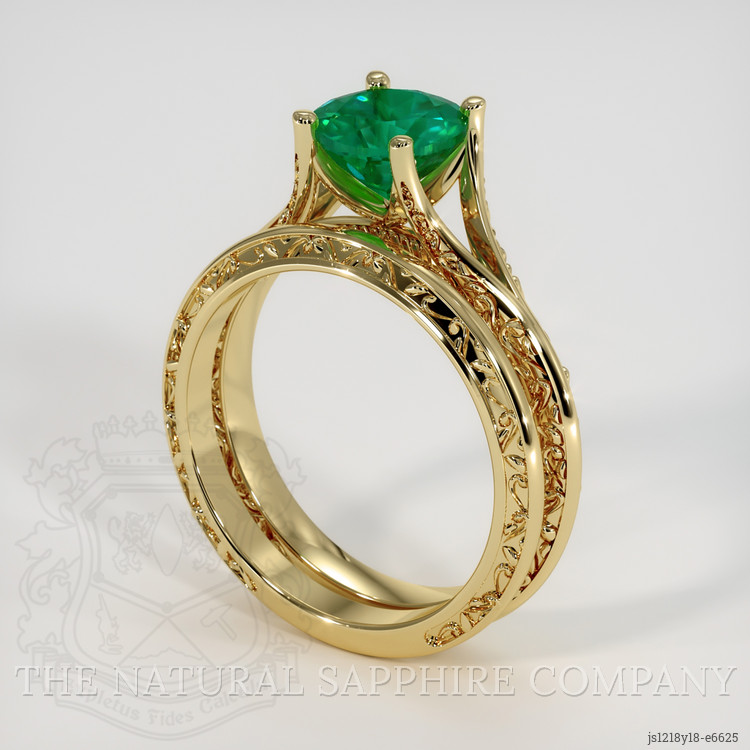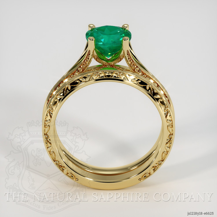 Encased in a luxurious 18K yellow gold setting, the ring not only enhances the emerald's inherent beauty but also symbolizes the timeless nature of precious relationships. Gold, a metal famed for its durability and classic warmth, complements the rich green of the emerald, reinforcing the narrative of eternity and stability in love. The yellow gold band, intricately designed, exudes sophistication and class. It ensures that while the emerald remains the centerpiece, the overall design speaks volumes about luxury and tradition.