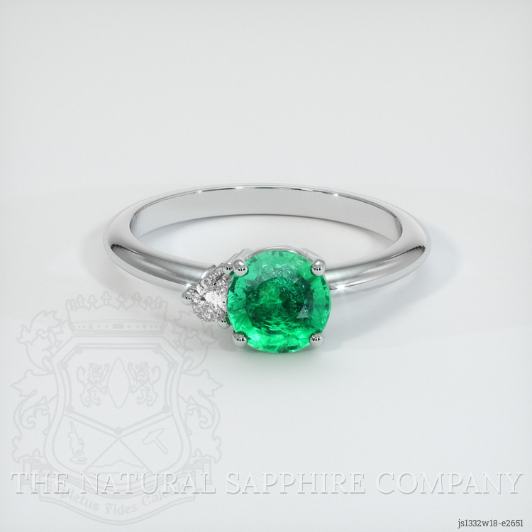 The ring features a beautiful, transparent 1.18 carat round shape green emerald with the dimensions of 6.65 x 6.49 x 5.02 mm and a mixed brilliant cut. It has a clarity grade of slightly included (evaluated at eye level), vivid color saturation, and an excellent polish. The origin of this emerald is Zambia.