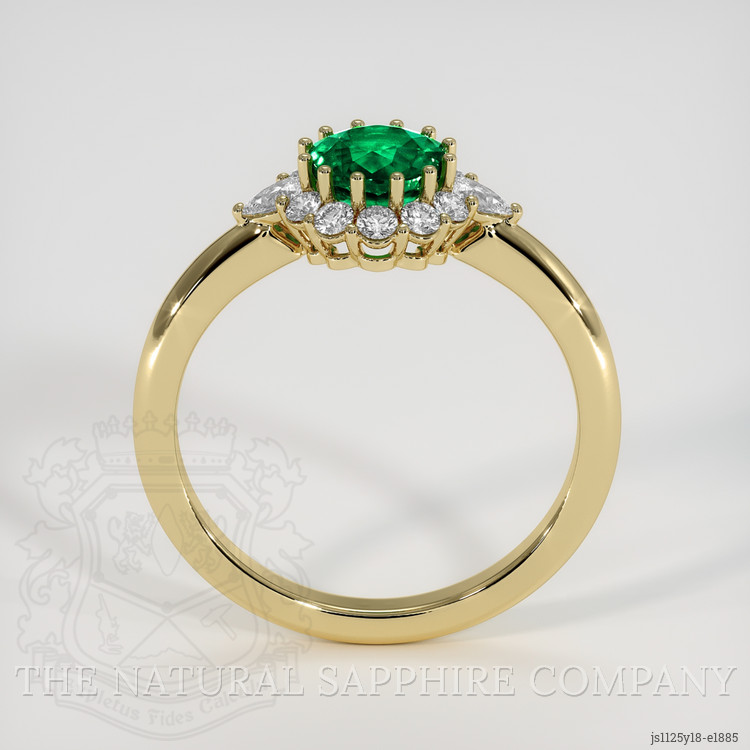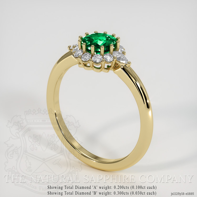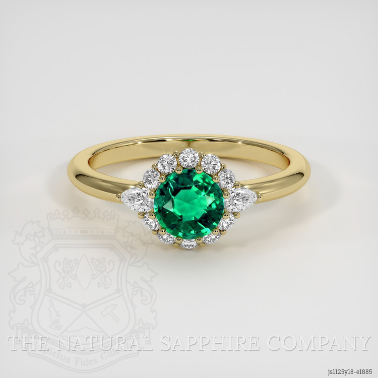 From the rich, mineral laden earth of Zambia a single crystal emerged with a color so vivid it seemed to hold its own light. At The Natural Emerald Company we trace this 1.18 carat round green emerald back to the mines where skilled hands and patient time coaxed its intense saturation into being. Cut in a mixed brilliant style and painstakingly polished to an excellent finish, the gem measures 6.88 by 6.81 by 4.27 millimeters and shows very slight inclusions when viewed at eye level, a natural fingerprint that attests to its authenticity. Standard enhancement has been applied with care to stabilize the stone while preserving the depth and clarity that make Zambian emeralds so prized. Around the central green heart we set a constellation of white diamonds, pear shaped stones weighing approximately 0.20 carat with clarity Very Slightly Included VS1 and VS2 and color grade E, and round diamonds totaling approximately 0.30 carat with clarity Very Slightly Included VS1 and VS2 and color grade F, each diamond chosen to amplify the emeralds glow without competing with its verdant presence.