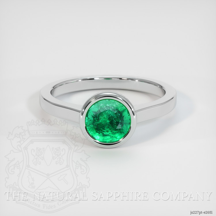 The men's ring features a beautiful, transparent 1.18 carat round shape green emerald with the dimensions of 6.65 x 6.49 x 5.02 mm and a mixed brilliant cut. It has a clarity grade of slightly included (evaluated at eye level), vivid color saturation, and an excellent polish. The origin of this emerald is Zambia.