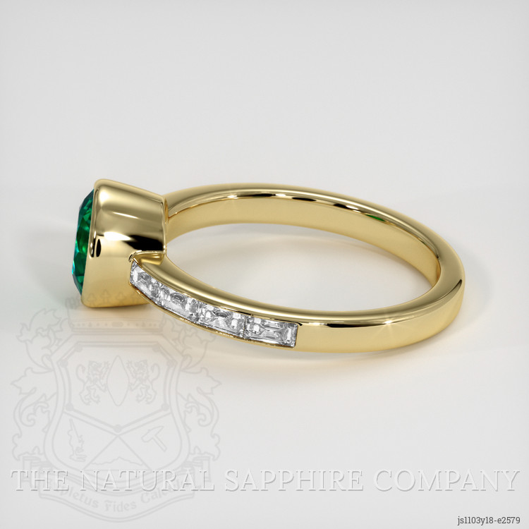 The presence of white baguette-shaped diamonds adds an exquisite touch of luxury to the ring. With a combined weight of approximately 0.48 carats, these diamonds display a clarity grade of Very Slightly Included, ranging from VS1 to VS2. This ensures that the diamonds possess minimal inclusions, invisible to the naked eye, contributing to their brilliant sparkle. The color grade of E highlights the diamonds' near-colorless quality, making them a perfect complement to the rich green of the emerald. The diamonds are artfully set to enhance the overall elegance of the design, perfectly balancing the vibrant central stone.