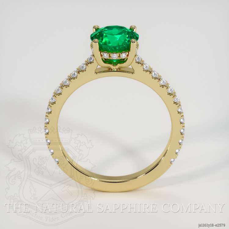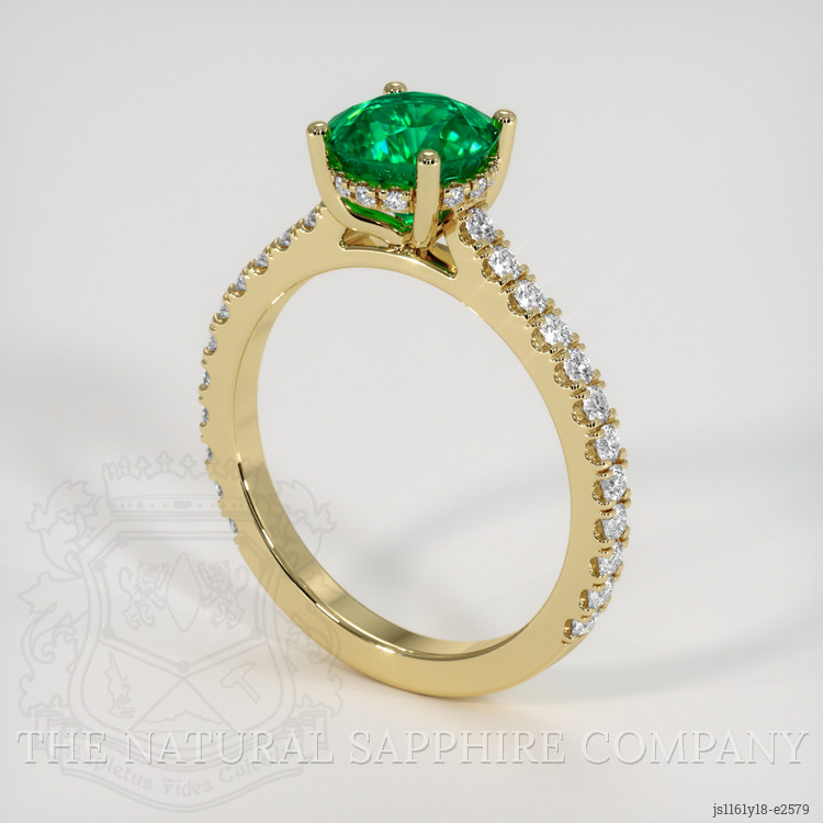 The exquisite ring presented by The Natural Emerald Company is an impeccable choice for commemorating significant life events. At the heart of this piece lies a stunning 1.20 carat green emerald. The emerald's round shape, with precise dimensions of 6.98 x 6.91 x 4.83 mm, showcases a mixed brilliant cut that enhances its natural elegance. Originating from Zambia, the emerald is distinguished by its vivid color saturation, an attribute that adds a unique vibrancy to the piece. With a clarity grade of very slightly included, as evaluated at eye level, this gem achieves a delicate balance of purity and character, further accentuated by its excellent polish.