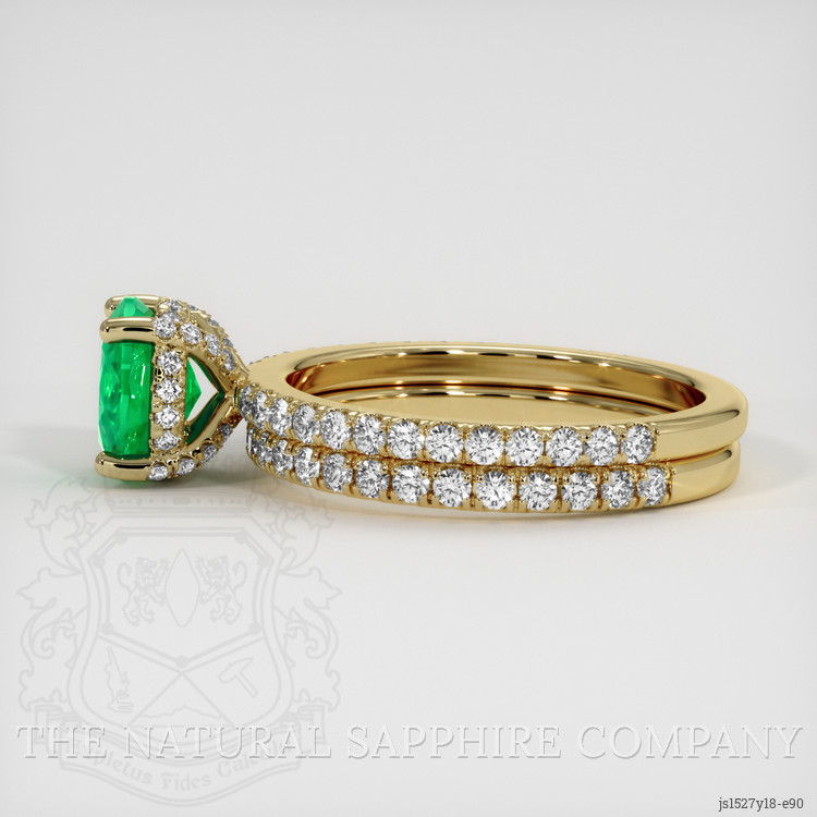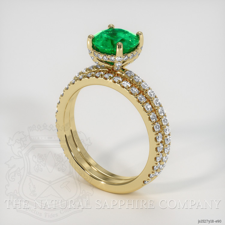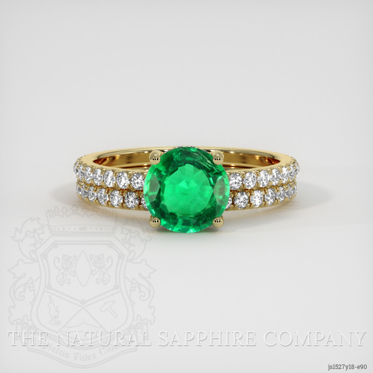 This emerald is held in a classic 18K Yellow Gold setting, code JS1527, a perfect contrast to the vibrant green, with a ball prong design that secures the emerald delicately. The setting is adorned with diamonds in a three-quarters shank, halo, and other pave positions. In the three-quarters shank position, two diamonds, each 0.504 carats, shine with an F grade color, their round shape designed to capture light at every turn. The halo surrounds the central stone with diamonds totaling 0.1425 carats, further enhancing the ring's radiant effulgence. An additional pave position adds a discreet yet sparkling touch with a diamond of 0.075 carats.
