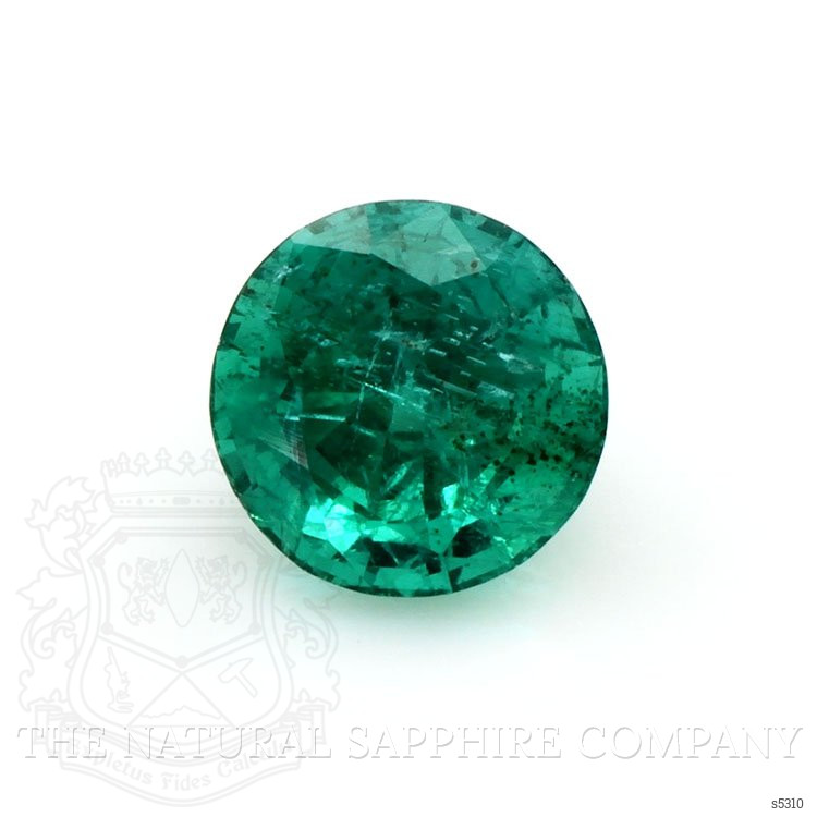 The ring features a beautiful, transparent 1.29 carat round shape green emerald with the dimensions of 6.76 x 6.82 x 5.28 mm and a mixed brilliant cut. It has a clarity grade of included (evaluated at eye level), intense color saturation, and an excellent polish. The origin of this emerald is Zambia.
