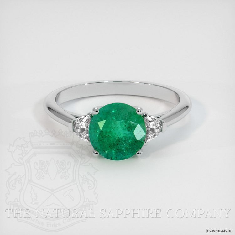 The ring features a beautiful, transparent 1.29 carat round shape green emerald with the dimensions of 7.37 x 7.26 x 4.74 mm and a mixed brilliant cut. It has a clarity grade of slightly included (evaluated at eye level), intense color saturation, and an excellent polish. The origin of this emerald is Zambia.