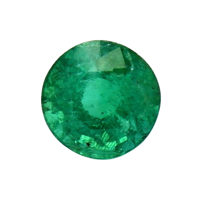 The ring features a beautiful, transparent 1.29 carat round shape green emerald with the dimensions of 6.73 x 6.56 x 5.15 mm and a mixed brilliant cut. It has a clarity grade of slightly included (evaluated at eye level), intense color saturation, and an excellent polish. The origin of this emerald is Zambia.
