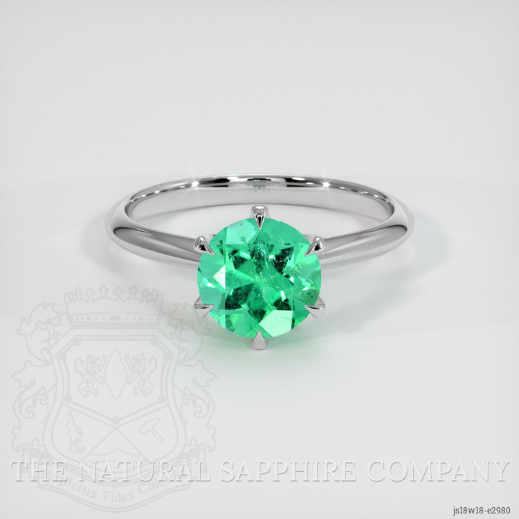 The ring features a beautiful, transparent 1.31 carat round shape green emerald with the dimensions of 7.33 x 7.29 x 5.08 mm and a mixed brilliant cut. It has a clarity grade of very slightly included (evaluated at eye level), medium color saturation, and an excellent polish. The origin of this emerald is Colombia.