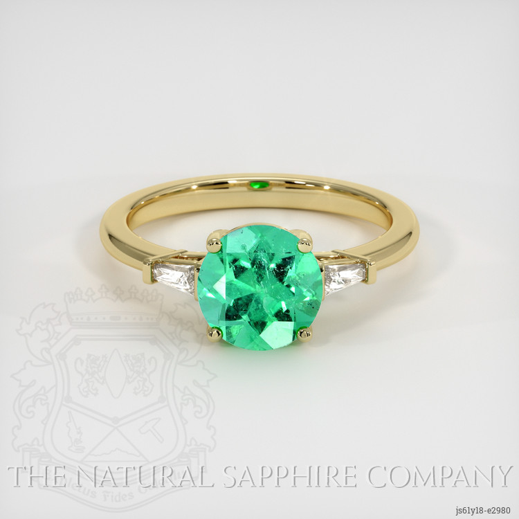 The ring features a beautiful, transparent 1.31 carat round shape green emerald with the dimensions of 7.33 x 7.29 x 5.08 mm and a mixed brilliant cut. It has a clarity grade of very slightly included (evaluated at eye level), medium color saturation, and an excellent polish. The origin of this emerald is Colombia.
