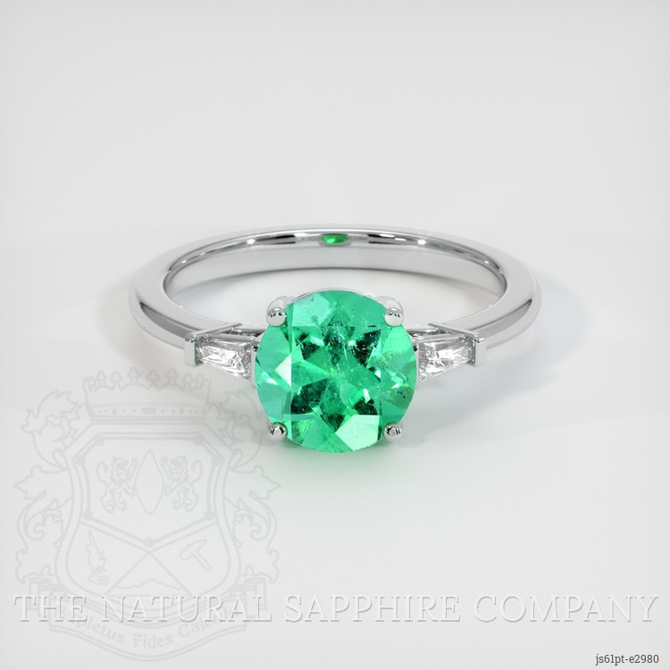 The ring features a beautiful, transparent 1.31 carat round shape green emerald with the dimensions of 7.33 x 7.29 x 5.08 mm and a mixed brilliant cut. It has a clarity grade of very slightly included (evaluated at eye level), medium color saturation, and an excellent polish. The origin of this emerald is Colombia.