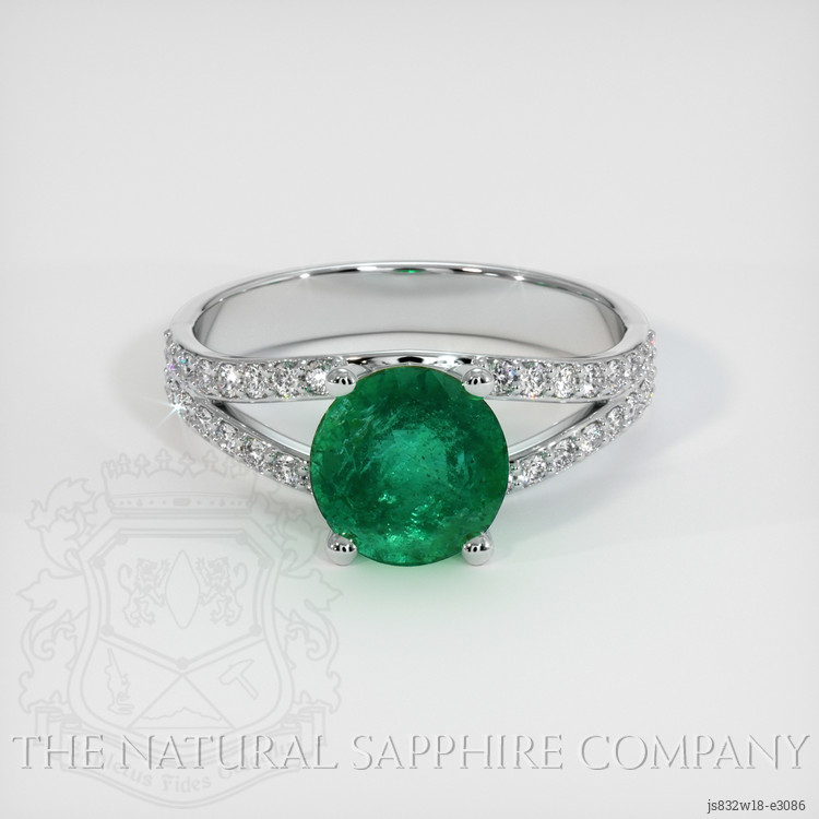 The ring features a beautiful, transparent 1.38 carat round shape green emerald with the dimensions of 7.10 x 7.04 x 5.13 mm and a mixed brilliant cut. It has a clarity grade of included (evaluated at eye level), vivid color saturation, and an excellent polish. The origin of this emerald is Zambia.