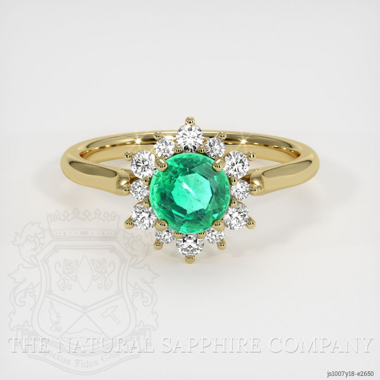 The ring features a beautiful, transparent 1.45 carat round shape green emerald with the dimensions of 7.35 x 7.23 x 4.85 mm and a mixed brilliant cut. It has a clarity grade of slightly included (evaluated at eye level), intense color saturation, and an excellent polish. The origin of this emerald is Zambia.