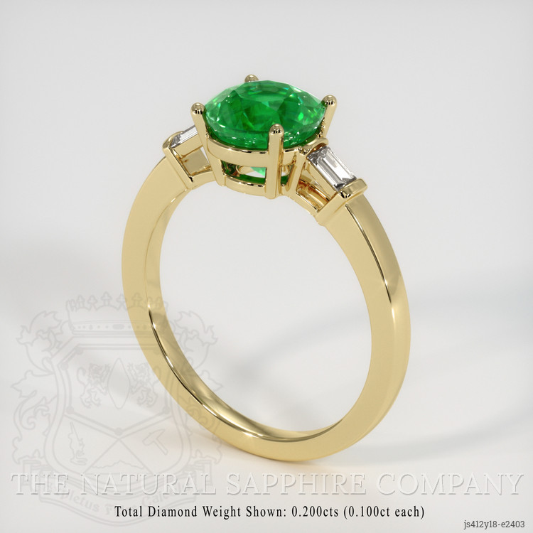 The ring features a beautiful, transparent 1.45 carat round shape green emerald with the dimensions of 7.23 x 7.15 x 5.40 mm and a mixed brilliant cut. It has a clarity grade of slightly included (evaluated at eye level), medium color saturation, and an excellent polish. The origin of this emerald is Zambia.