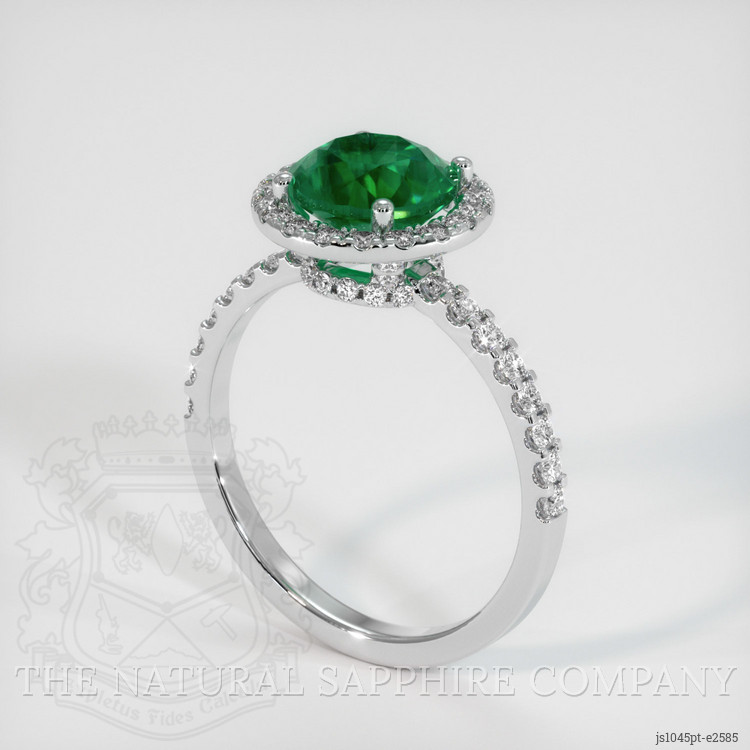 The ring features a beautiful, transparent 1.45 carat round shape green emerald with the dimensions of 7.33 x 7.29 x 5.14 mm and a mixed brilliant cut. It has a clarity grade of very slightly included (evaluated at eye level), vivid color saturation, and an excellent polish. The origin of this emerald is Zambia.