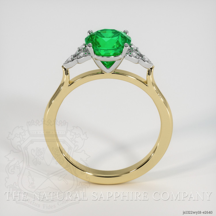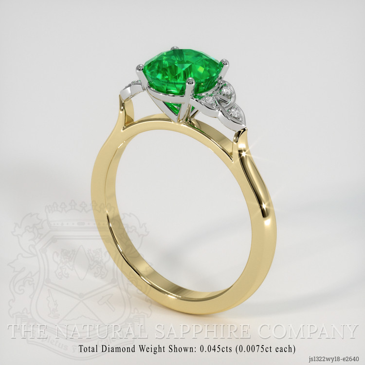 Set amidst the commanding emerald are white round-shaped diamonds, subtly complementing the central stone. These diamonds weigh approximately 0.045 carats each and are of an exceptional clarity grade, precisely categorized at VS1 and VS2. With a remarkable F color grade, the diamonds exhibit a near-colorless quality, offering a brilliant contrast that accentuates the emerald's vibrant green. These harmonious combinations exemplify The Natural Emerald Company's commitment to quality, ensuring that each ring is handcrafted to embody sophistication and excellence.