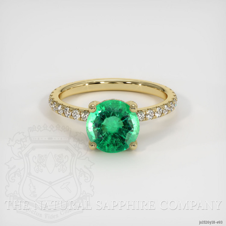 The ring features a beautiful, transparent 1.54 carat round shape green emerald with the dimensions of 7.53 x 7.45 x 4.85 mm and a mixed brilliant cut. It has a clarity grade of slightly included (evaluated at eye level), intense color saturation, and an excellent polish. The origin of this emerald is Zambia.