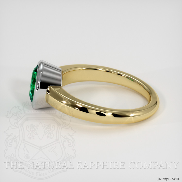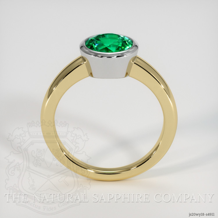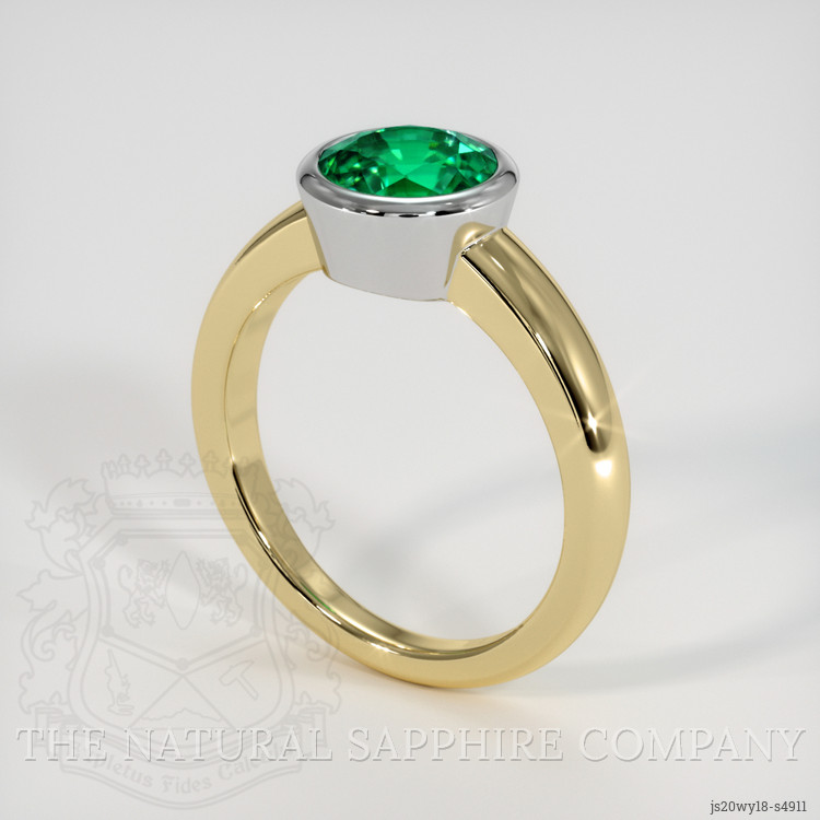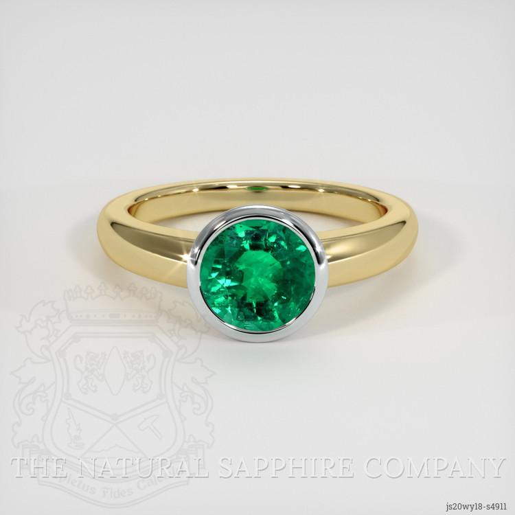 The men's ring features a beautiful, transparent 1.57 carat round shape green emerald with the dimensions of 7.57 by 7.46 by 5.01 millimeters and a mixed brilliant cut. It has a clarity grade of very slightly included, evaluated at eye level. The emerald boasts vivid color saturation and an excellent polish, ensuring maximum brilliance and sparkle. Crafted with precision, the origin of this exquisite emerald is Zambia, known for producing stones of superior quality and vibrant hues. The ring setting and band material combine two metals, offering an elegant dual-tone design. It is entirely set in 18 carat white gold and 18 carat yellow gold, creating a striking contrast that highlights the stone beautifully. The meticulous craftsmanship showcases the skilled artistry involved in creating this piece. The choice of metal ensures not only a visually appealing finish but also an enduring quality, suitable for everyday wear. The blend of richly colored emerald and the sleek white and yellow gold setting results in a timeless and durable accessory, perfect for those who appreciate classic elegance and intricate details. The durability of the materials makes it ideal for daily wear, promising lasting beauty and resilience.