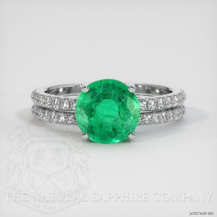 The ring features a beautiful, transparent 1.70 carat round shape green emerald with the dimensions of 7.73 x 7.60 x 4.94 mm and a mixed brilliant cut. It has a clarity grade of slightly included (evaluated at eye level), medium color saturation, and an excellent polish. The origin of this emerald is Zambia.