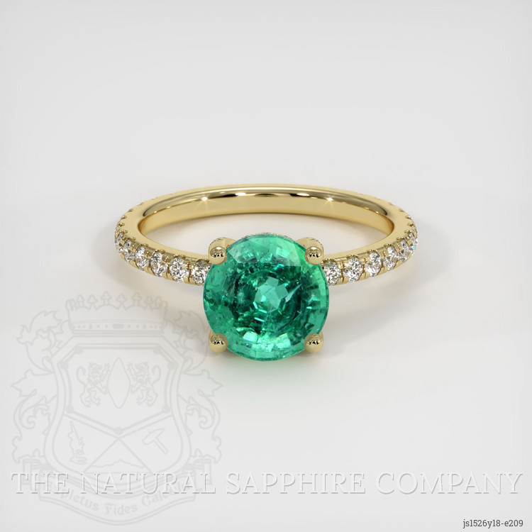 The ring features a beautiful, transparent 1.85 carat round shape green emerald with the dimensions of 7.72 x 7.68 x 5.58 mm and a mixed brilliant cut. It has a clarity grade of slightly included (evaluated at eye level), medium color saturation, and an excellent polish. The origin of this emerald is Zambia.