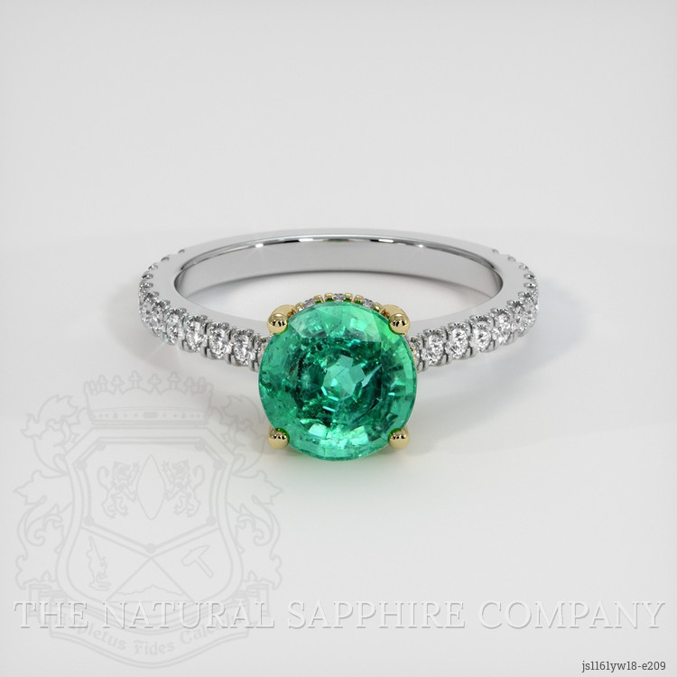 The essence of timeless beauty and historical opulence is captured in this exquisite creation by The Natural Emerald Company. Featuring a stunning 1.85 carat round shape green emerald, this ring embodies the radiant elegance of Zambian origin. Known for their unparalleled quality and vibrant color, Zambian emeralds trace their lineage back to the ancient lands, celebrated for their lush landscapes and rich history. The emerald's transparent quality and mixed brilliant cut are akin to a master's painting where every angle reveals a new facet of luminescent artistry. The emerald measures 7.72 x 7.68 x 5.58 mm, boasting a clarity grade of slightly included, yet this only adds to its character and singular beauty. Its medium color saturation weaves a tale of earthy richness, speaking to those who treasure tradition and legacy in their possessions.