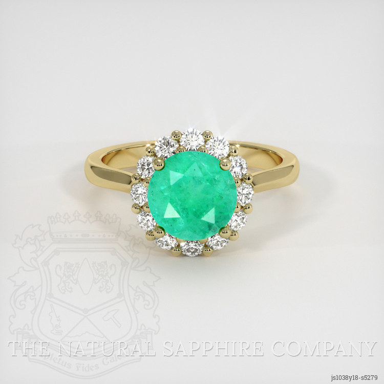 The ring features a beautiful, transparent 1.89 carat round shape green emerald with the dimensions of 7.76 x 7.77 x 6.00 mm and a mixed brilliant cut. It has a clarity grade of included (evaluated at eye level), medium color saturation, and an excellent polish. The origin of this emerald is Ethiopia.