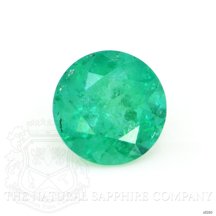 The ring features a beautiful, transparent 1.95 carat round shape green emerald with the dimensions of 8.02 x 7.98 x 5.88 mm and a mixed brilliant cut. It has a clarity grade of included (evaluated at eye level), medium color saturation, and an excellent polish. The origin of this emerald is Ethiopia.