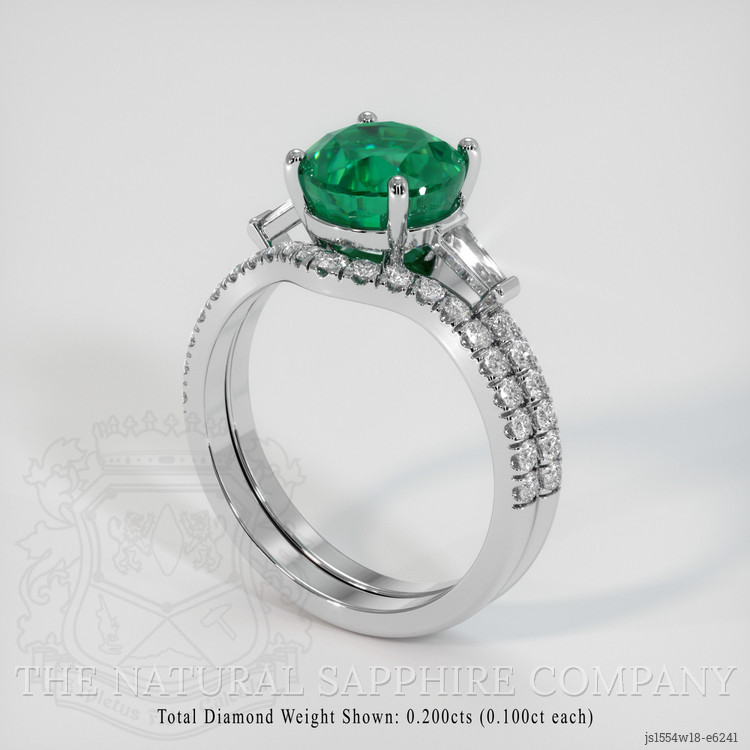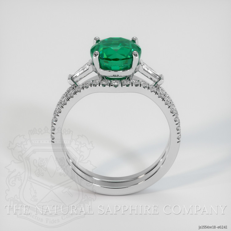 Encased within the embrace of 18K white gold, the emerald is complemented by a spectacular array of white diamonds. Tapered baguette-shaped diamonds, with a total weight of approximately 0.20 carats, feature a clarity grade of VS1/VS2 and a pristine color grade of E, adding a shimmering frame to our central emerald. To further accentuate its beauty, meticulously chosen round-shaped diamonds form a symphony of light and brilliance around the emerald. Weighing approximately 0.36 carats and 0.44 carats respectively, each diamond holds a VS1/VS2 clarity and a color grade of F, creating a dazzling interplay of luxury and sophistication.