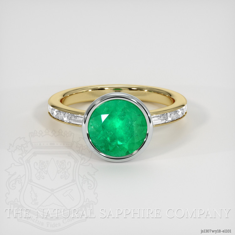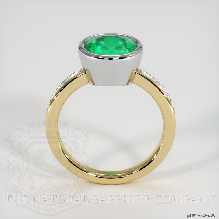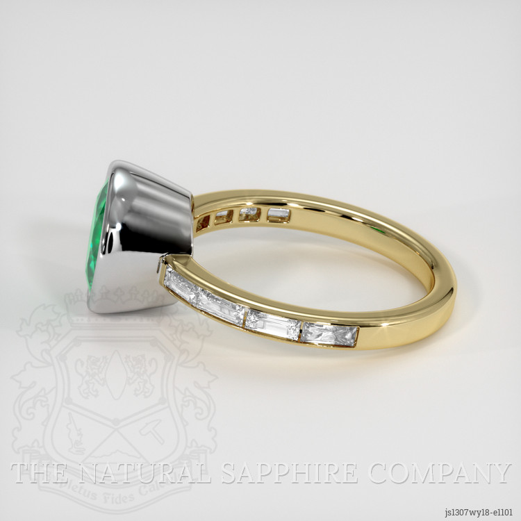 Once unearthed, this emerald embarks on an extraordinary transformation. Its dimensions, 8.76 x 8.68 x 5.98 mm, and mixed brilliant cut are meticulously honed to enhance its inherent beauty. With a clarity grade of slightly included and a medium color saturation that captures the eye, this emerald is polished to perfection, exuding a vibrant hue that tells tales of its ancient origins. Partnered with the pristine white baguette diamonds, collectively weighing approximately 0.56 carats with a clarity of VS1 and VS2, and a color grade of E, this emerald forms the centerpiece of a stunning ring. The design is an artful blend of white and yellow 18K gold, crafting an elegant canvas that highlights the gems’ brilliance.