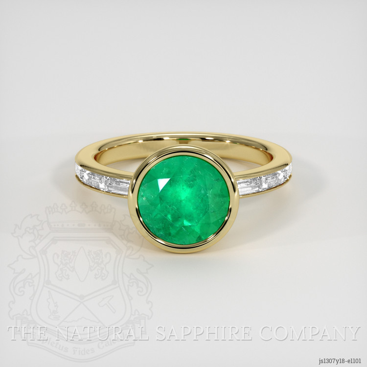 The ring from The Natural Emerald Company features a captivating 2.19 carat green emerald, renowned for its round shape and striking transparency. With dimensions measuring 8.76 x 8.68 x 5.98 mm, this emerald is expertly crafted with a mixed brilliant cut, enhancing its innate luminosity. The clarity grade of slightly included ensures that any inclusions are minimal and add character to the piece without detracting from its overall beauty. The emerald’s medium color saturation reflects a balanced hue, making it a desirable choice for those seeking a blend of vibrancy and depth. Sourced from Colombia, the emerald boasts an excellent polish, indicative of superb craftsmanship and meticulous attention to detail.