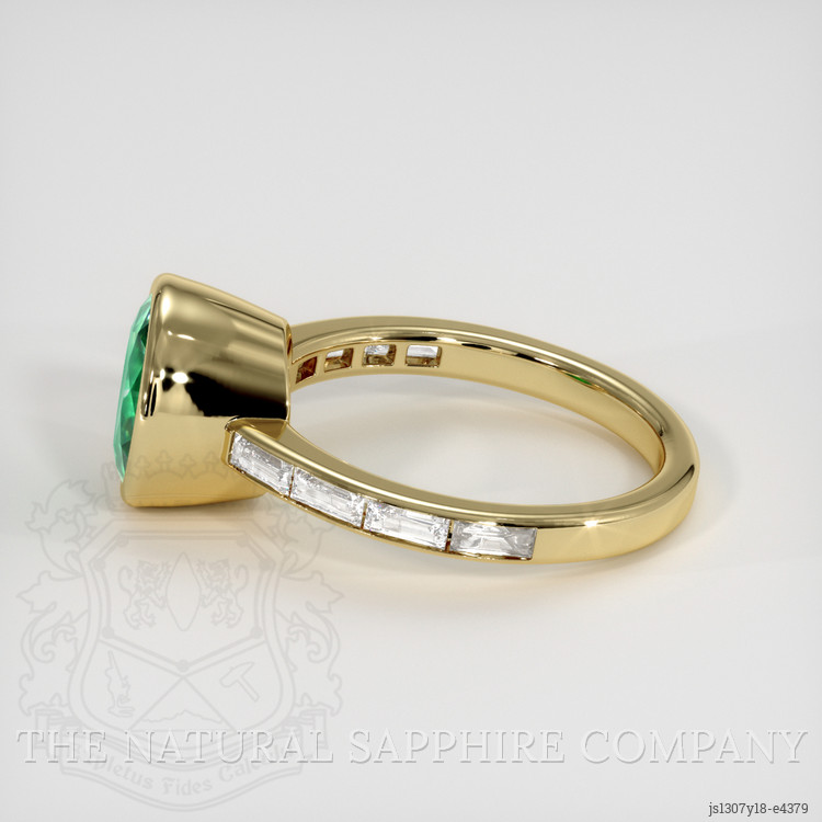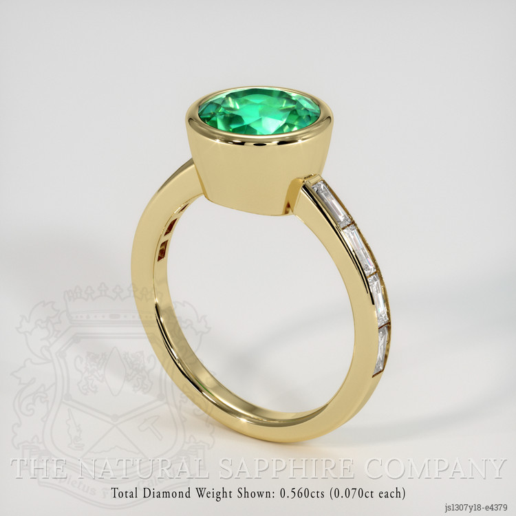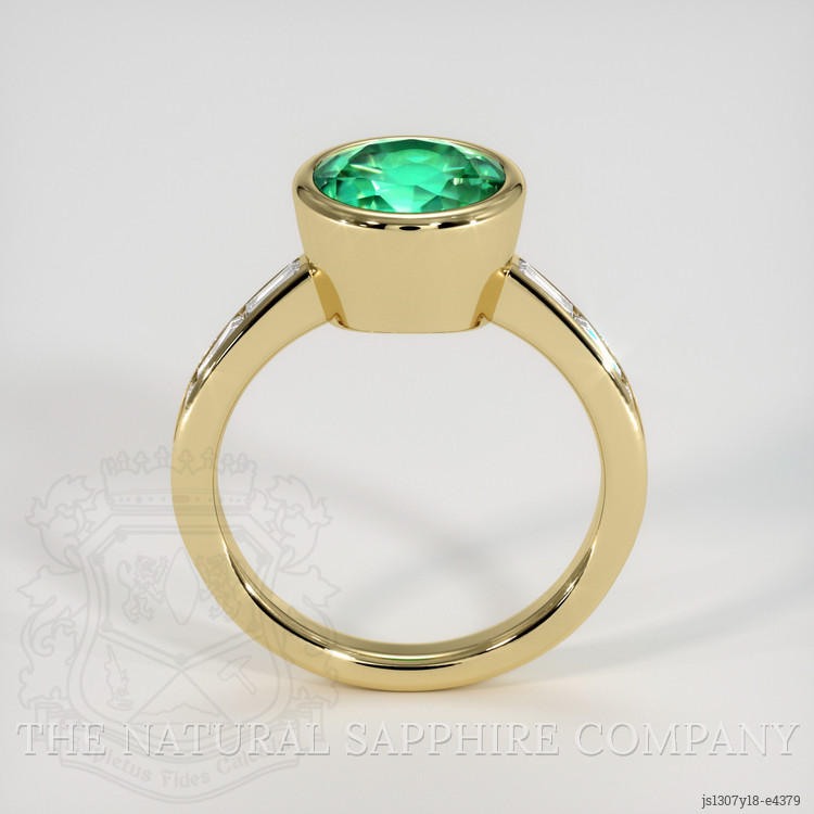 The design surrounding this exceptional emerald has been conceived to complement and protect it, while elevating the overall silhouette to a timeless luxury piece. Flanking the center are straight, white baguette diamonds totaling approximately 0.56 carats, each selected for their bright E color and eye clean, Very Slightly Included grades of VS1 and VS2. These diamonds are channel set into the 18 karat yellow gold shoulders, providing a clean, elegant line that emphasizes the round center without competing with it. The emerald itself is set in a secure, polished bezel that both highlights the gemstone and offers additional protection for daily wear, a practical consideration for an item intended to be treasured for a lifetime. The mixed brilliant cut of the center increases scintillation when it catches the light, and the warm tone of 18 karat yellow gold creates a contemporary, yet enduring contrast that enhances the green without overshadowing it. The result is a ring that functions equally well as an engagement piece, a signature ring, or a collector s showpiece, satisfying a desire for something distinct and unmistakably valuable.