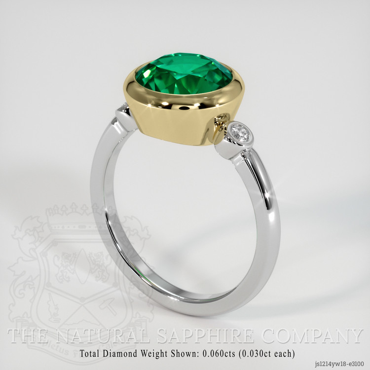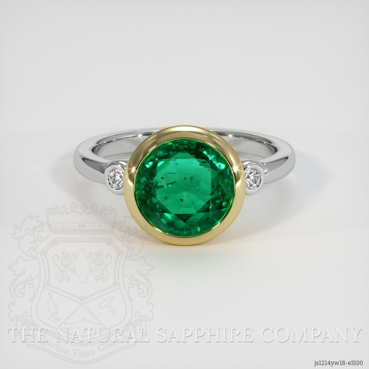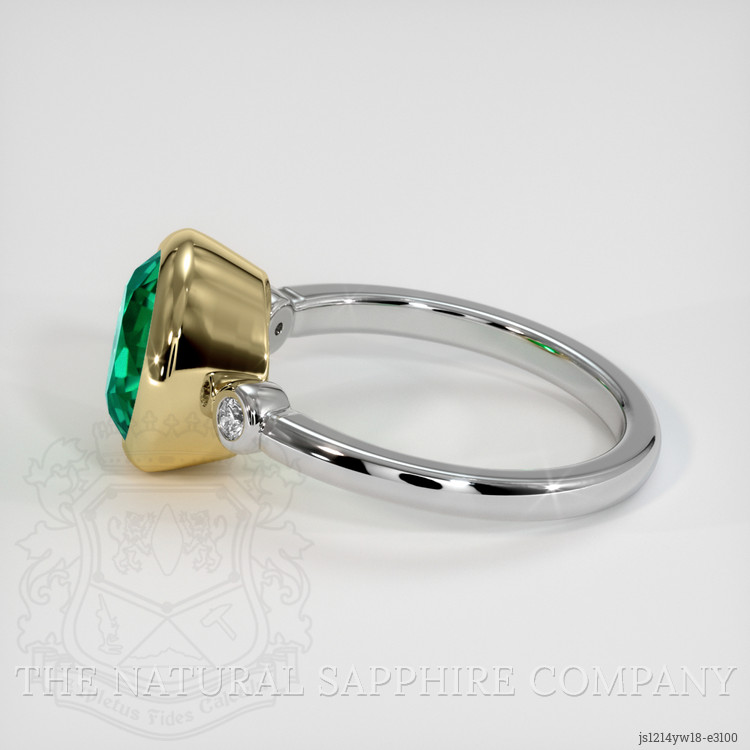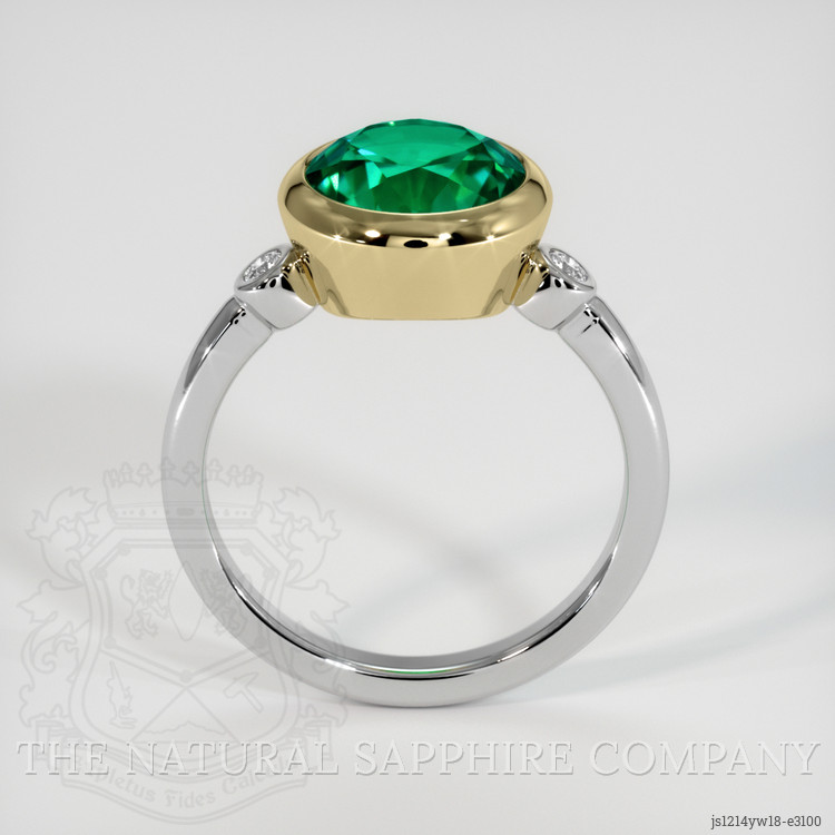 Accompanying this magnificent emerald are delicate white round diamonds, weighing approximately 0.06 carats. These diamonds, with their very slightly included clarity grade (VS1, VS2) and a color grade of F, flawlessly accentuate the emerald's rich color while adding a subtle touch of brilliance. Set entirely in a harmonious combination of 18K yellow gold and 18K white gold, the dual tones create a striking contrast, enhancing the regal appearance of the gemstones. This ring by The Natural Emerald Company is not only a display of exceptional craftsmanship but also a testament to the enduring elegance of emeralds, perfect for those who appreciate tradition and legacy in their jewelry.