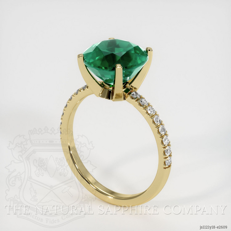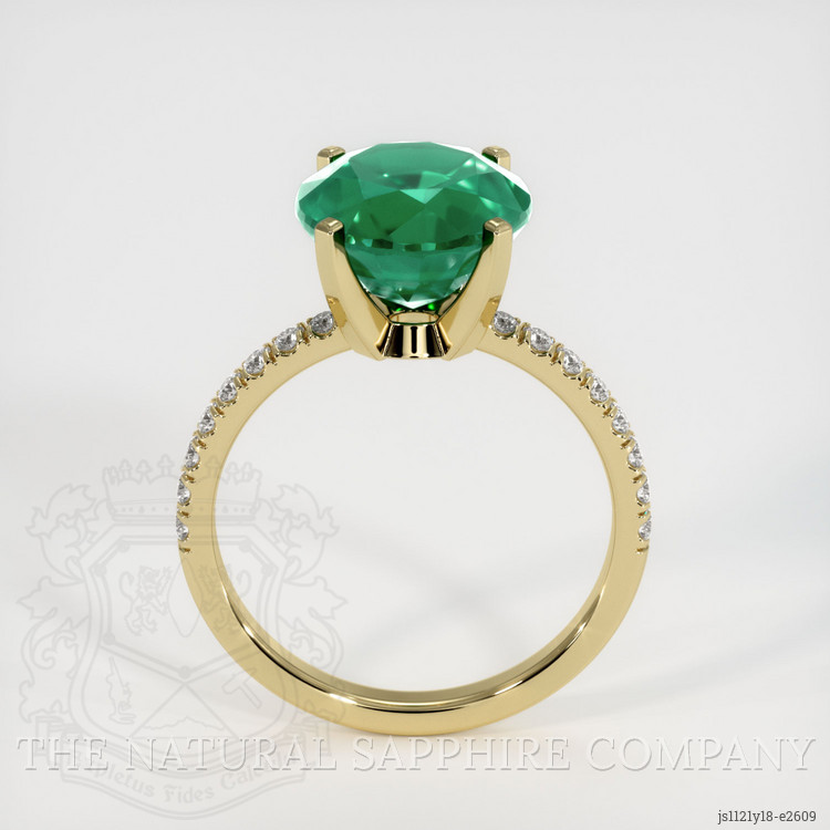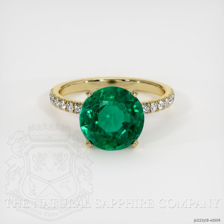 The ring features a beautiful, transparent 3.36 carat round shape green emerald with the dimensions of 9.79 x 9.69 x 6.35 mm and a mixed brilliant cut. It has a clarity grade of slightly included (evaluated at eye level), vivid color saturation, and an excellent polish. The origin of this emerald is Zambia.