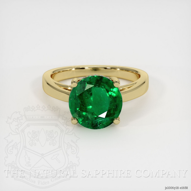 The ring features a beautiful, transparent 3.42 carat round shape green emerald with the dimensions of 9.79 x 9.60 x 6.54 mm and a mixed brilliant cut. It has a clarity grade of very slightly included (evaluated at eye level), vivid color saturation, and an excellent polish. The origin of this emerald is Zambia.