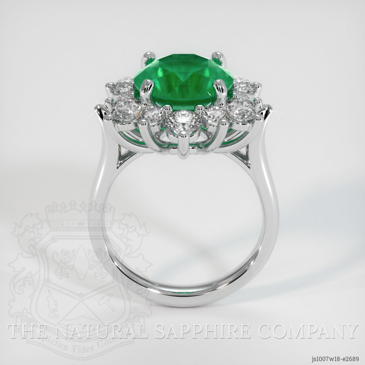 The ring features a beautiful, transparent 3.85 carat round shape green emerald with the dimensions of 10.31 x 10.13 x 6.82 mm and a mixed brilliant cut. It has a clarity grade of very slightly included (evaluated at eye level), intense color saturation, and an excellent polish. The origin of this emerald is Zambia.