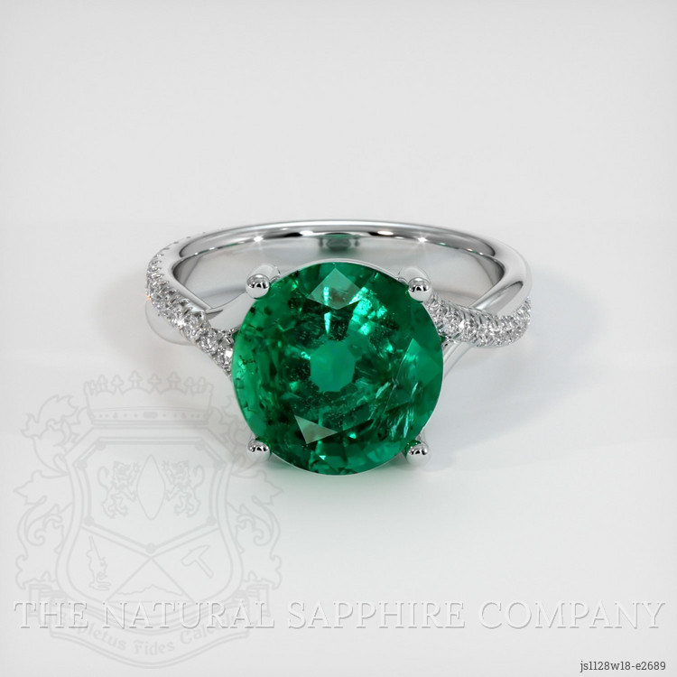 The ring features a beautiful, transparent 3.85 carat round shape green emerald with the dimensions of 10.31 x 10.13 x 6.82 mm and a mixed brilliant cut. It has a clarity grade of very slightly included (evaluated at eye level), intense color saturation, and an excellent polish. The origin of this emerald is Zambia.