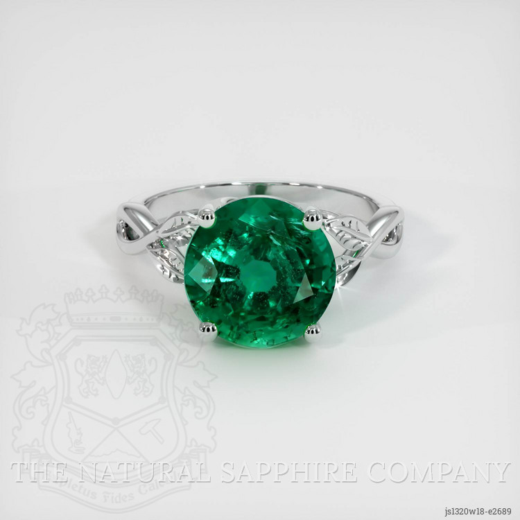 The ring features a beautiful, transparent 3.85 carat round shape green emerald with the dimensions of 10.31 x 10.13 x 6.82 mm and a mixed brilliant cut. It has a clarity grade of very slightly included (evaluated at eye level), intense color saturation, and an excellent polish. Enhancement: standard. The origin of this emerald is Zambia.