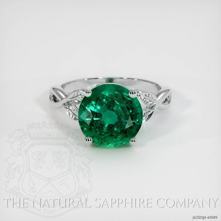 The ring features a beautiful, transparent 3.85 carat round shape green emerald with the dimensions of 10.31 x 10.13 x 6.82 mm and a mixed brilliant cut. It has a clarity grade of very slightly included (evaluated at eye level), intense color saturation, and an excellent polish. The origin of this emerald is Zambia.